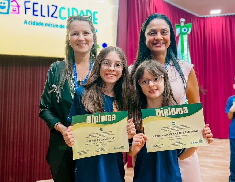 Nesta terça-feira (7) o presidente do Tribunal Regional Eleitoral do Paraná (TRE-PR), desembargador Wellington Emanuel Coimbra de Moura presidiu a diplomação dos políticos mirins da Cidade Mirim “Feliz Cidade”, projeto do Colégio Católica Curitiba. Na foto, ao centro, à esquerda, a vice-prefeita, Rafaela Bonim Pinto, e à direita, a prefeita Maria Julia Klinczak Raymundo. Ao fundo, Andréia Godoy, coordenadora da Ed. Infantil e Anos Iniciais e a diretora do Colégio, Vanusa Vilarinho Kikina.