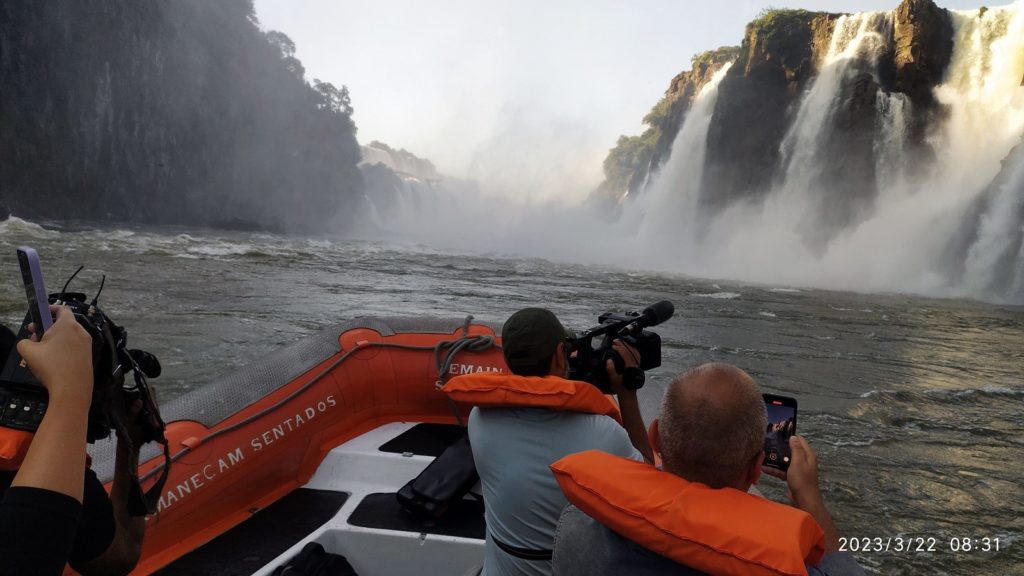 No final do passeio com a carretinha, vem o passeio na trilha suspensa de 600 metros, até chegar no deck do bondinho, que leva o visitante até o embarque para a mais emocionante aventura. O barco sobe o rio Iguaçu até chegar bem perto das grandes quedas das Cataratas, que é uma experiência única e emocionante.
