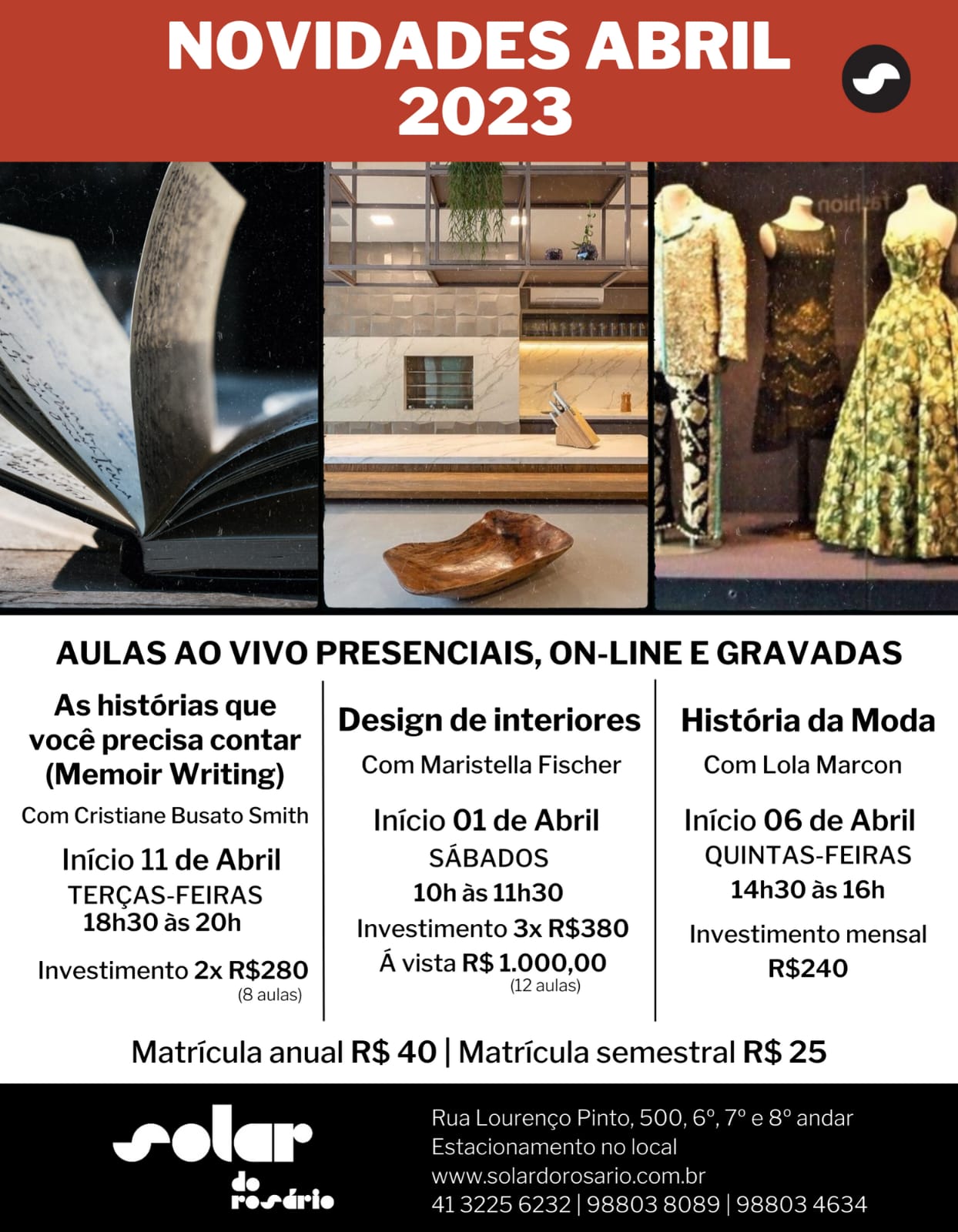 Novidades em cursos e oficinas para abril já estão confirmadas no Solar do Rosário. Cursos contínuos de escrita, história da arte e da moda e design, entre outros, completam as opções para o próximo mês no centro cultural. Mais informações pelos telefones (41) 3225-6232 – 98803-4634 – 98803-8089. As inscrições estão abertas.