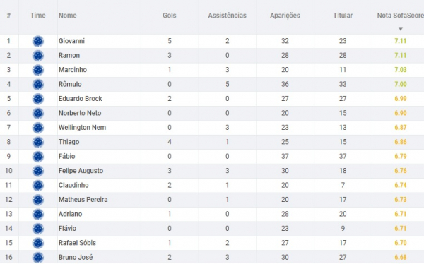JOGADORES DO CRUZEIRO NO RANKING SOFASCORE DA SÉRIE B 2021