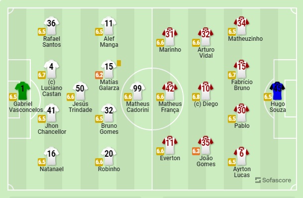 Flamengo: Hugo; Matheuzinho (Rodnei), Fabrício Bruno (Matheus Gonçalves), Pablo e Ayrton Lucas; Diego (Mateusão), João Gomes e Vidal (Erick Pulgar); Marinho, Everton Cebolinha e Matheus França. Técnico: Dorival Júnior