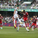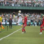 31 – Falta na esquerda. Em vez de cruzar, Jesús Trindade tenta direto, rasteiro. A bola vai na rede, pelo lado de fora.