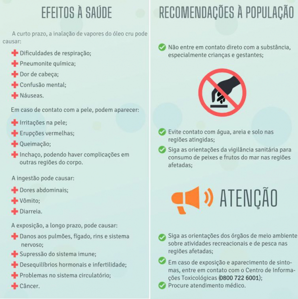 A cartilha recomenda que a população não entre em contato direto com o óleo, especialmente gestantes e crianças. Também é preciso observar as orientações da vigilância sanitária para o consumo de alimentos, como peixes e mariscos, provenientes das áreas afetadas.