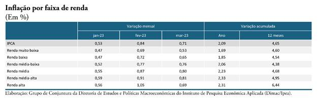 Os dados acumulados em 12 meses também mostram que, até março de 2023, na comparação com o mês imediatamente anterior, a inflação desacelerou para todas as faixas de renda. Com exceção do segmento de renda alta, todas as demais classes já registram variações em 12 meses abaixo de 5,0%.