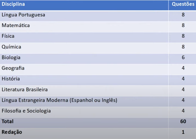 A prova terá 60 questões e mais a prova de redação. O tempo de aplicação da prova será de 5 horas.