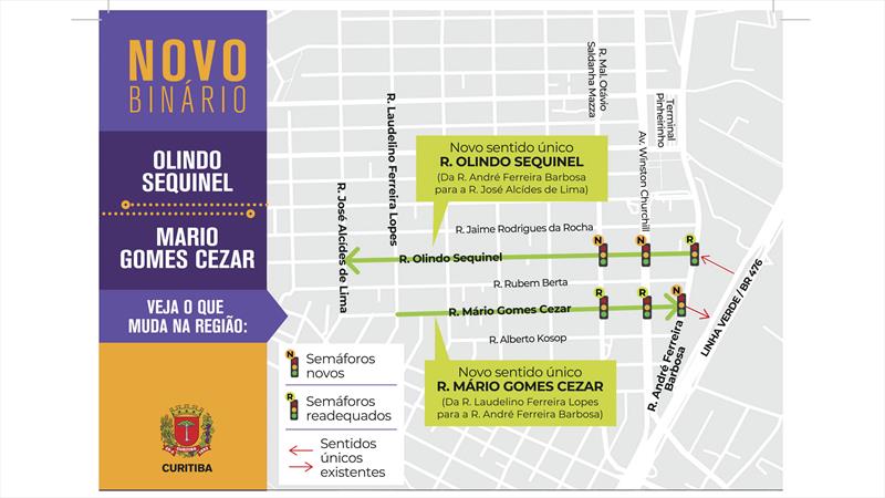 O novo binário das ruas Mário Gomes Cezar e Olindo Sequinel, no Pinheirinho, começa a funcionar a partir desta terça-feira (21/3), às 11h. O trecho contará com uma ciclofaixa de 1.100 metros na Rua Mário Gomes Cezar, além de vagas para estacionamento.