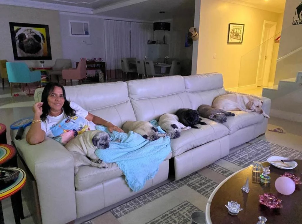 Pude conhecer a matilha de pugs da Orliane quando visitei a casa dela no Rio de Janeiro. Na época eram cinco da raça. Atualmente, ela é tutora da Gisele, Maíra, Valentina e Eva. Aninha, de 15 anos, partiu recentemente. É fácil entender por que ela se considera uma pugmaníaca.