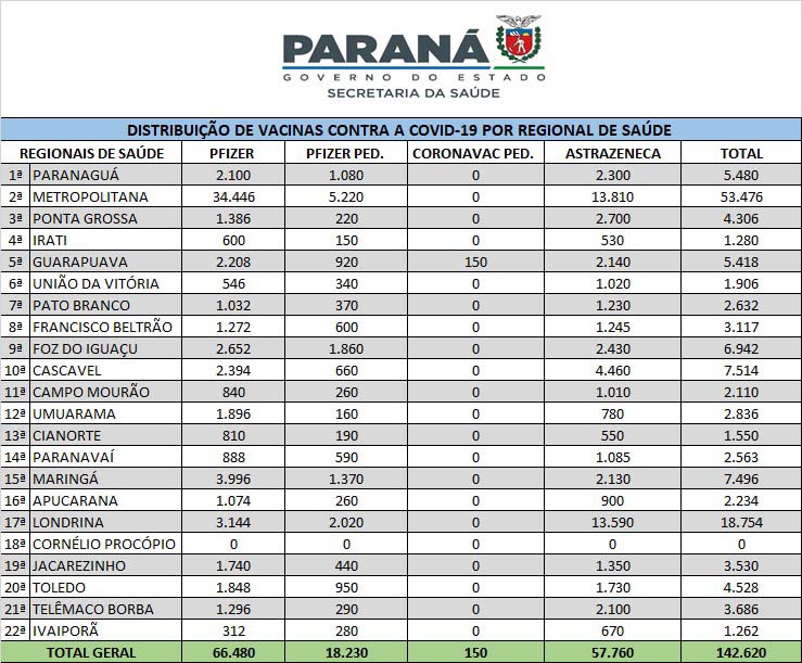 Ao todo, 142.620 vacinas foram descentralizadas, via terrestre, do Centro de Medicamentos do Paraná (Cemepar) para as Regionais de Saúde. Desse volume, 66.480 doses da Pfizer são destinadas para adolescentes a partir dos 12 anos; 57.760 da Astrazeneca vão para a população acima de 18 anos; 18.230 Pfizer pediátrica (5 a 11 anos) e 150 CoronaVac para a segunda dose de crianças de 3 a 4 anos, por solicitação da Secretaria Especial de Saúde Indígena (Sesai).