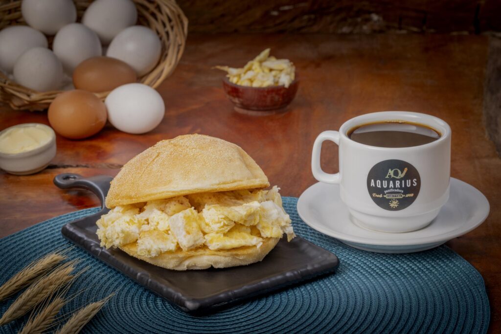 Aquarius – Pão na chapa com ovos mexidos. Acompanha uma xícara média de café puro tradicional.