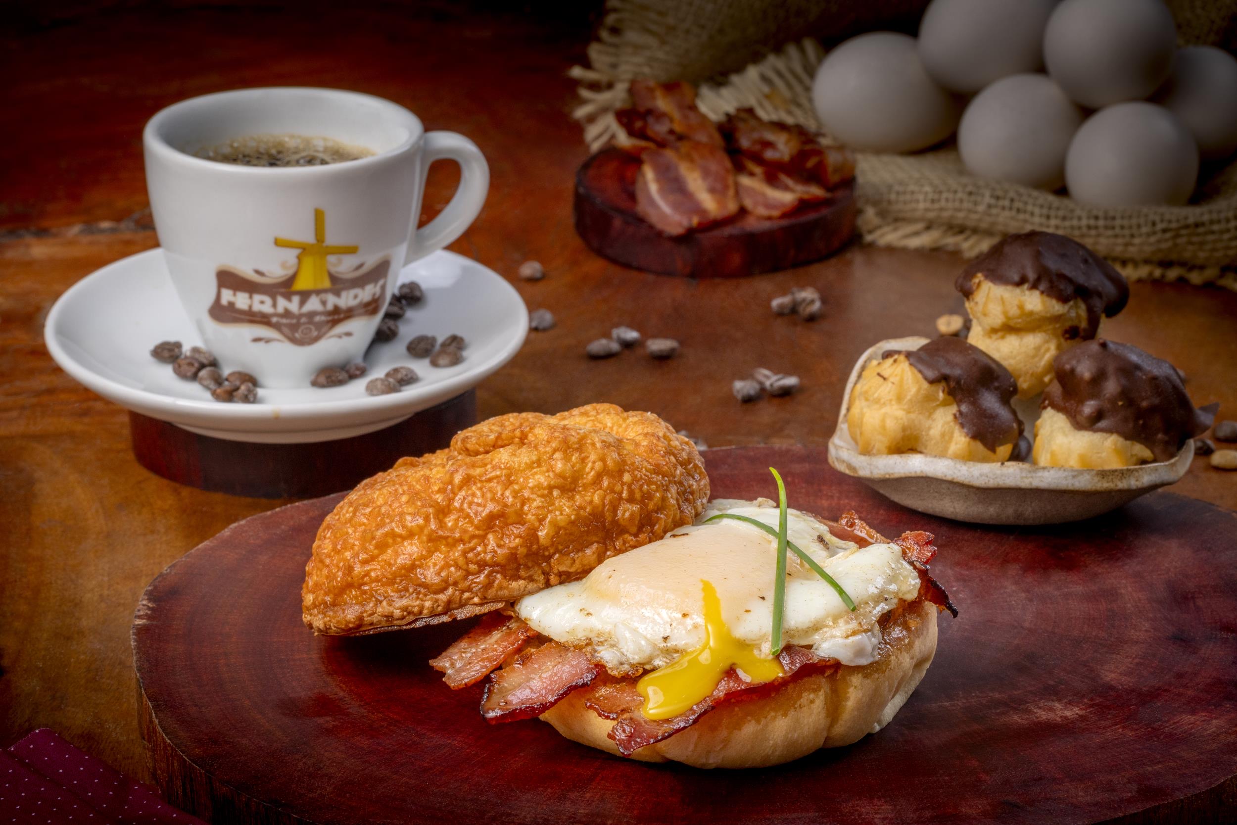 Panificadora Fernandes: Pão de água na chapa com crosta de provolone, bacon e ovo frito. Vem com três carolinas de nutella e café coado ou suco de laranja