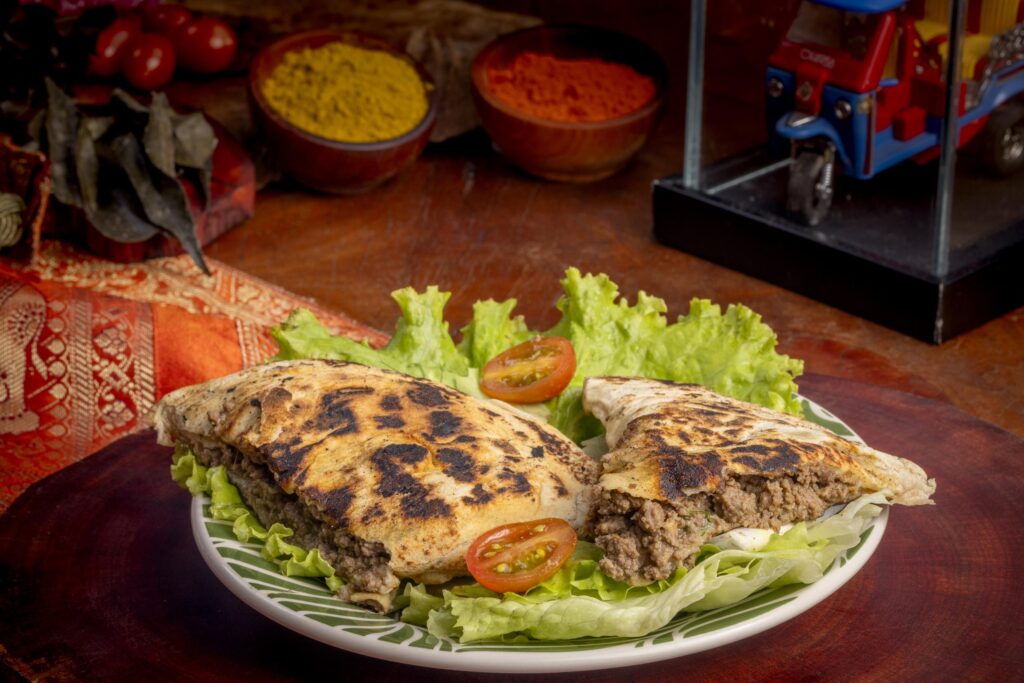 Tuk Tuk – Pão na chapa Tuk Tuk – pão naan recheado com carne, ghee e condimentos indianos, assado em chapa quente.